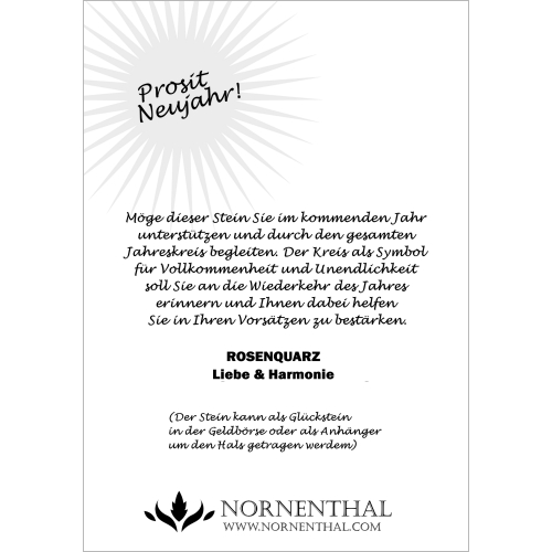 Hochwertiger Nornenthal Silvester Glücksbringer. Edelstein in Donutform in der Größe 20 mm geschützt im Druckverschlussbeutel. Inklusive Möglichkeit zur Überbringung persönlicher Wünsche auf der Innenseite. So wird es möglich mit Edelsteinen auch zu Silvester individuelle Freude zu bereiten. Der Kreis als Symbol für Vollkommenheit und Unendlichkeit soll seinen Träger an die Wiederkehr des Jahres erinnern und ihm dabei helfen in seinen Vorsätzen zu bestärken.