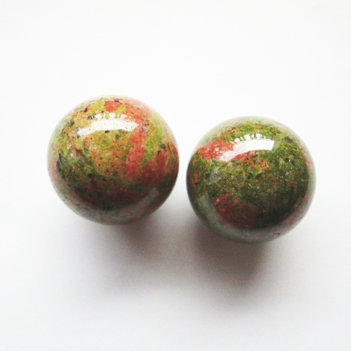 Bei diesem Artikel handelt es sich um 2 Exemplare einer je 40 mm großen vollen Steinkugel aus Unakit. Das Kugelpaar ist hervorragend dazu geeignet als Qigong Kugeln eingesetzt zu werden. Qigong-Kugeln sind ideal zum Entspannen, Meditieren, Konzentrieren oder auch Massieren.