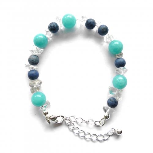 Dieses Armband, mit den Steinen Amazonit, Bergkristall und Dumortierit, kann dabei helfen auch in einem stressigen Alltag zu innerer Ausgeglichenheit zurück zu finden oder diese zu bewahren. Dumotierit und Bergkristall stärken Belastbarkeit, Konzentration und Selbstbesinnung. Der Hauptstein Amazonit hilft gegen Zerissenheit und Stimmungsschwankungen und hilft seinem Träger angemessen auf Einflüsse von Außen zu reagieren.